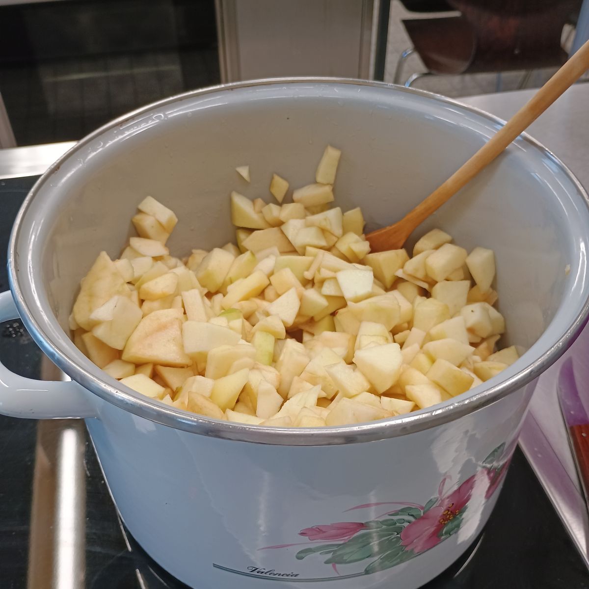 In der Küche haben wir dann in gemeinsamen Kleingruppen Küchenmesser und Kochlöffel geschwungen und große Portionen Apfelmus selbst zubereitet.