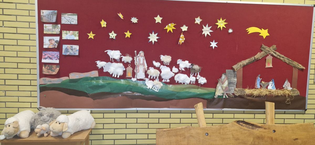 . In diesem Jahr wurden sie gestaltet von den Klassen 3 und 6. Grund – und Oberschüler lernten den Hirten Habakuk kennen, der sich besonders um Schafe kümmerte, die es schwer hatten. Im Laufe der Wochen wuchs im Eingangsbereich ein Bild, das uns daran erinnerte, dass auch wir füreinander „Hirten“ sein können. Vervollständigt wurde das Bild mit dem Kind im Stall. Jesus, der für uns geboren worden ist und sich um uns sorgt wie sonst niemand.